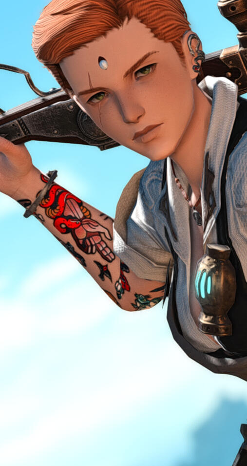 At first glance, one could mark Ianthe as a soldier from a malm away. She's lean and muscled, although she's fallen on times far too hard to maintain her previous musculature. She's slender, and her clothes fit her frame with space to spare. Regardless, she cuts an imposing figure in full armor: she's of average stature for a full-blooded Garlean, but she stands head and shoulders above many Eorzeans.More striking is the face beneath the helm. Ianthe has soft, strawberry blonde hair and gentle, downturned green eyes marred by a ragged scar through one lid and brow. If there was damage to her eye itself, it's been meticulously repaired. Her lips are full and rose-pink. If she were to wear her hair longer, she might as well have the face of a fairy-tale heroine or a theatre's leading lady. Instead, she's cropped her hair short and bulked her frame.As if in protest of that cherubic little face, a series of tattoos run down her skin, covering both arms as well as large portions of her chest. Their wearer has ever been loath to explain what they all mean. Can't they just be for fun, she asks? Perhaps, but the marks look like far more than that.